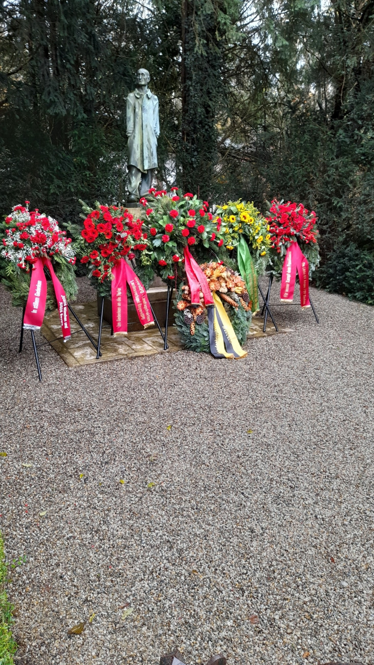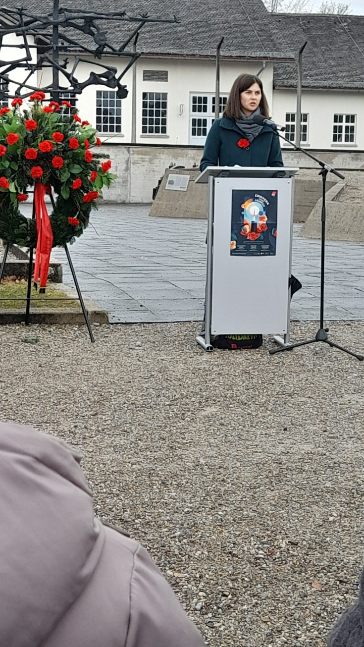Anschließend zogen die Teilnehmer weiter zum Krematorium und legten Kränze am Denkmal des unbekannten Häftlings nieder. Die Hauptrede hielt Dr. Anette Seidel-Arpaci, Leiterin des Recherche- und Informationsstelle Antisemitismus (RIAS) Bayern. Sie berichtete von sich mehrenden antisemitischen Vorfällen. Diese beschränke sich nicht nur auf verbale Angriffe. Es kommt auch vermehrt zu tätlichen Angriffen. Die Shoa wird nach ihrer Meinung zu häufig relativiert. Sie forderte sich gegen jede Form des Antisemitismus zu wehren.